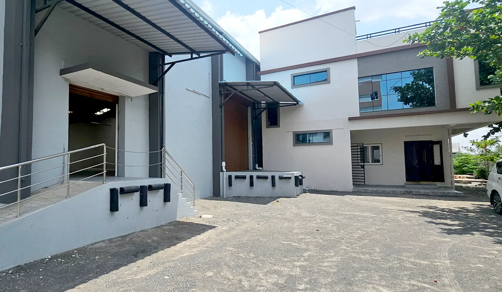 10,000 sq.ft RCC warehouse with 3 dock doors, high clearance, and 2,000 sq.ft office—ideal for FMCG, Pharma, Agri & E-commerce storage.